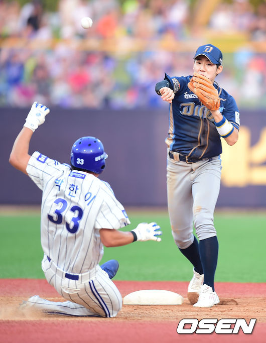 27일 오후 포항 야구장에서 열린 '2014 한국야쿠르트 세븐 프로야구' 삼성 라이온즈와 NC 다이노스의 경기, 2회말 무사 주자 1,2루 삼성 김헌곤의 3루수 앞 땅볼때 박한이를 2루에서 포스아웃 시킨 NC 2루수 박민우가 1루로 송구하고 있다.