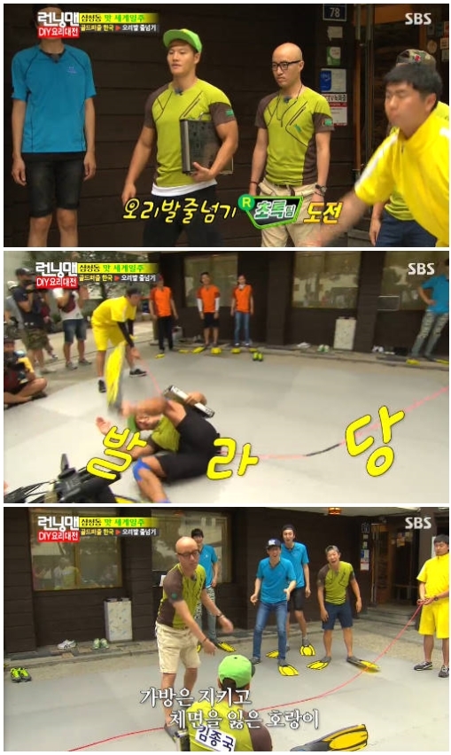 김종국은 골드 퍼즐을 건 오리발 줄넘기에 가방을 들고 출전했다. 앞서 파랑팀의 유재석과 이광수 주원이 북아메리카 대륙 퍼즐을 몰래 가져간 것을 염두에 둔 것. 하지만 가방을 품에 안고 줄넘기에 뛰어든 탓에 그는 발라당 넘어지고 말았다.