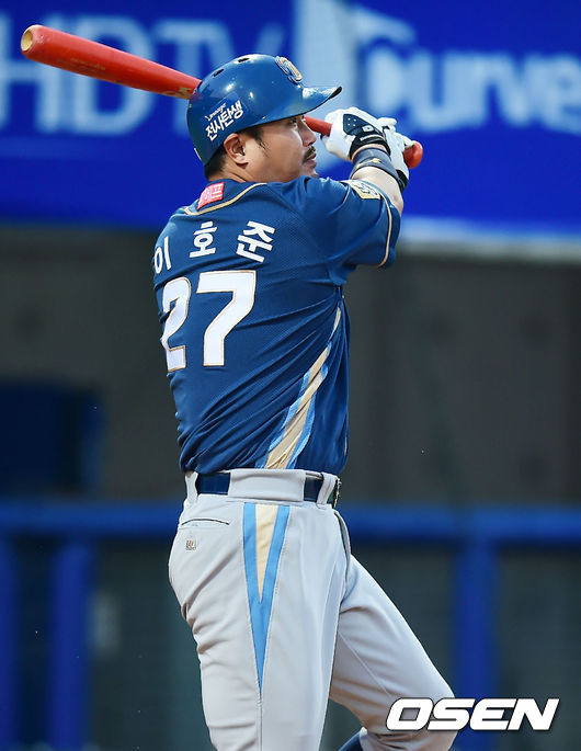 27일 오후 포항 야구장에서 열린 '2014 한국야쿠르트 세븐 프로야구' 삼성 라이온즈와 NC 다이노스의 경기, 4회초 NC 선두타자 이호준이 중견수 왼쪽 2루타를 날리고 있다.