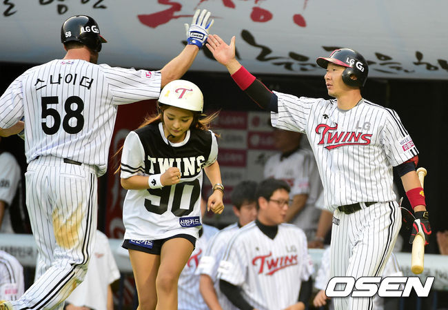 4회말 1사 2,3루에서 LG 스나이더가 채은성의 좌익수 플라이에 태그업, 홈을 밟고 손주인과 하이파이브를 하고 있다.
