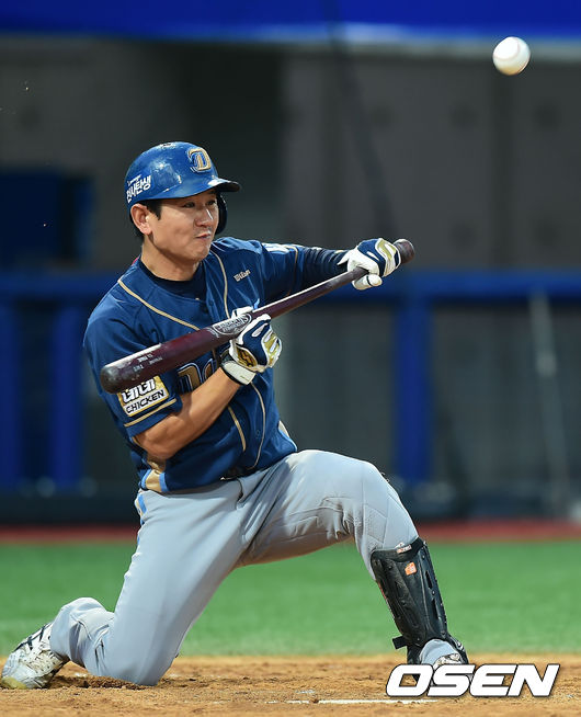 27일 오후 포항 야구장에서 열린 '2014 한국야쿠르트 세븐 프로야구' 삼성 라이온즈와 NC 다이노스의 경기, 4회초 무사 주자 1,2루 NC 손시헌이 번트를 시도했으나 볼이 높이 뜨고 있다.
