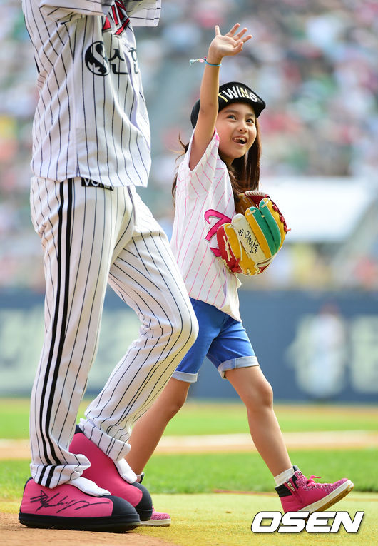 경기에 앞서 아역배우 갈소원이 시구를 마치고 팬들에 인사를 하고 있다.