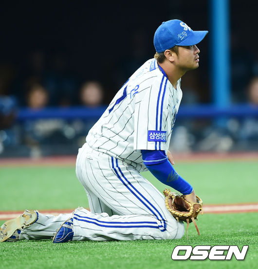 27일 오후 포항 야구장에서 열린 '2014 한국야쿠르트 세븐 프로야구' 삼성 라이온즈와 NC 다이노스의 경기, 4회초 무사 주자 1,2루 NC 손시헌이 번트를 시도했으나 볼이 높이 뜨며 삼성 1루수 채태인이 몸을 날려 잡은 후 2루로 송구하려다 포기하고 있다.