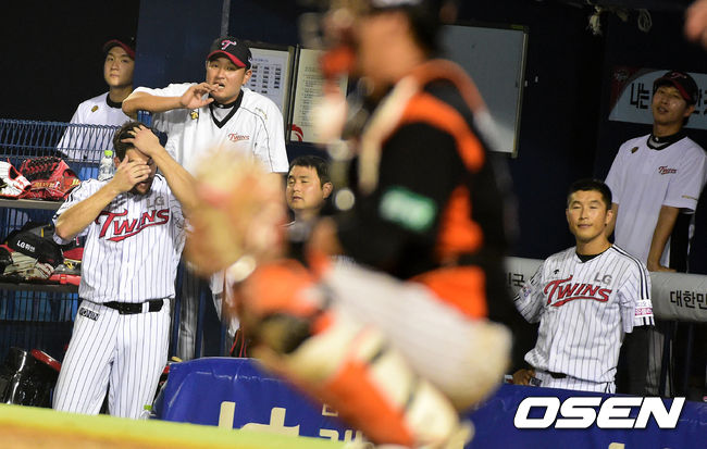 8회말 1사 만루에서 LG 스나이더가 2루수 플라이로 물러나며 더그아웃에서 아쉬워하고 있다.