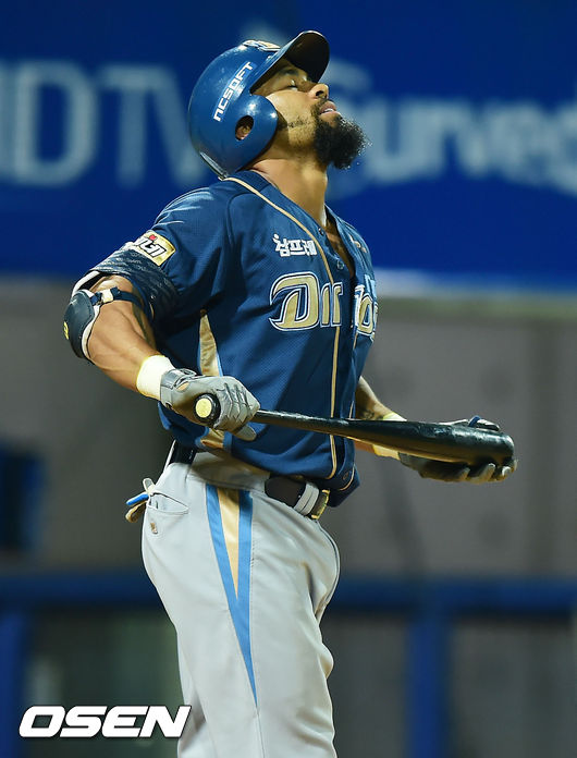 27일 오후 포항 야구장에서 열린 '2014 한국야쿠르트 세븐 프로야구' 삼성 라이온즈와 NC 다이노스의 경기, 7회초 1사 주자 1,2루 NC 테임즈가 타석에서 삼진아웃을 당한 후 아쉬워하고 있다.