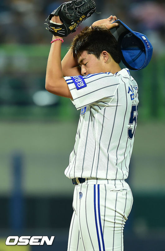 27일 오후 포항 야구장에서 열린 '2014 한국야쿠르트 세븐 프로야구' 삼성 라이온즈와 NC 다이노스의 경기, 7회초 2사 주자 1,2루 NC 이호준에게 볼넷을 내주며 주자가 만루가 되자 삼성 심창민이 땀을 닦고 있다.