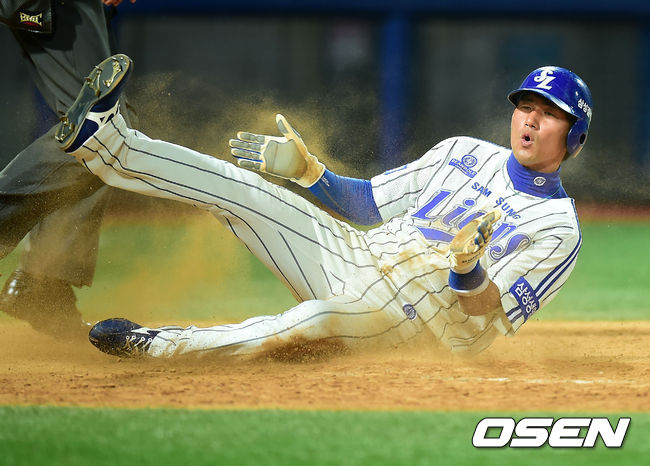 27일 오후 포항 야구장에서 열린 '2014 한국야쿠르트 세븐 프로야구' 삼성 라이온즈와 NC 다이노스의 경기, 7회말 1사 주자 1,3루 삼성 나바로의 좌익수 왼쪽 2타점 적시타때 1루 주자 김상수가 홈으로 몸을 날리며 세이프 되고 있다.
