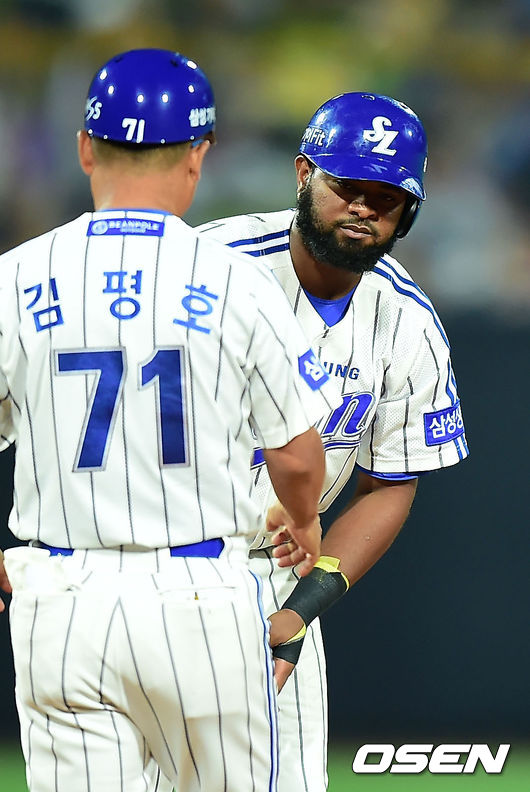 27일 오후 포항 야구장에서 열린 '2014 한국야쿠르트 세븐 프로야구' 삼성 라이온즈와 NC 다이노스의 경기, 7회말 1사 주자 1,3루 삼성 나바로가 좌익수 왼쪽 2타점 적시타를 날린 후 2루에서 김평호 코치와 하이파이브를 하고 있다.