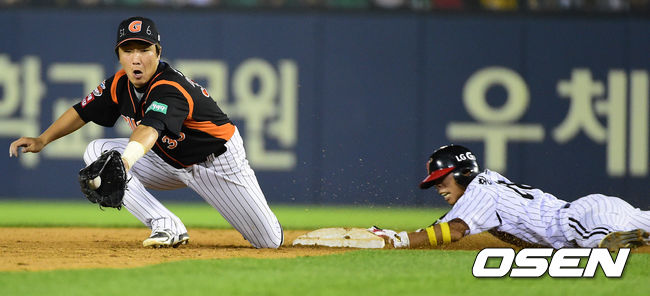 9회말 1사 1루에서 LG 황목치승이 롯데 정훈의 태그에 앞서 2루 도루에 성공하고 있다.