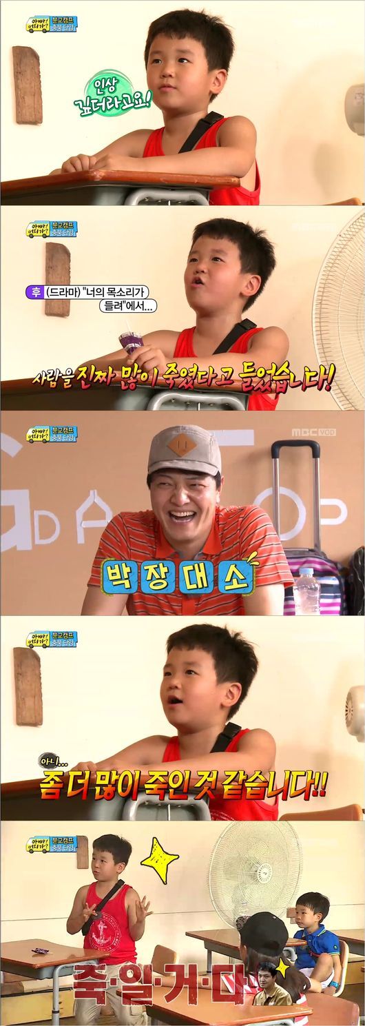 특히 ‘죽일 거다’라는 대사를 하면서 야무지게 손동작까지 하며 평소 정웅인에 대해 많은 관심을 가지고 있었다는 것을 알게 했다. 당사자인 정웅인마저도 윤후의 귀여운 상황극에 박장대소했다.
