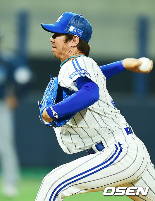 27일 오후 포항 야구장에서 열린 '2014 한국야쿠르트 세븐 프로야구' 삼성 라이온즈와 NC 다이노스의 경기, 9회초 마운드에 오른 삼성 임창용이 힘차게 공을 뿌리고 있다.