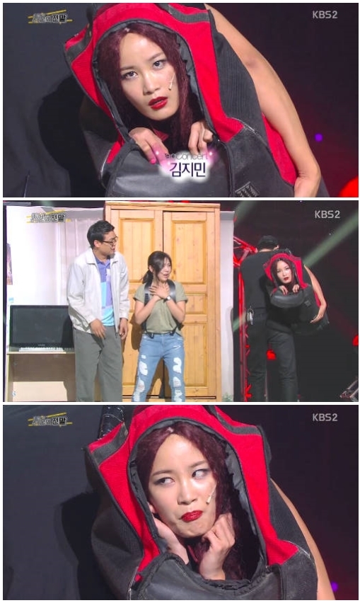 개그우먼 김지민이 이번엔 가방에 몸을 숨겼다.