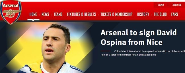 아스날이 2014 브라질 월드컵서 콜롬비아의 골문을 책임졌던 다비드 오스피나(25)를 영입했다.