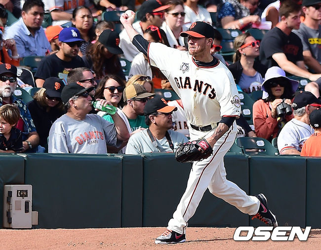28일(이하 한국시간) 미국 캘리포니아주 샌프란시스코 AT&T 파크에서 열린 '2014 메이저리그' 샌프란시스코 자이언츠와 LA 다저스의 경기에 앞서 샌프란시스코 제이크 피비가 몸을 풀고 있다.