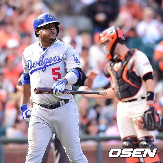 28일(이하 한국시간) 미국 캘리포니아주 샌프란시스코 AT&T 파크에서 열린 '2014 메이저리그' 샌프란시스코 자이언츠와 LA 다저스의 경기, 2회초 1사 1,3루 유리베가 삼진으로 물러나고 있다.