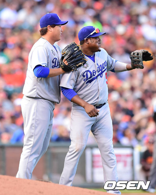 28일(이하 한국시간) 미국 캘리포니아주 샌프란시스코 AT&T 파크에서 열린 '2014 메이저리그' 샌프란시스코 자이언츠와 LA 다저스의 경기, 류현진이 헌터 팬스의 투수 강습타구를 처리한 후 유리베와 환하게 웃고 있다.