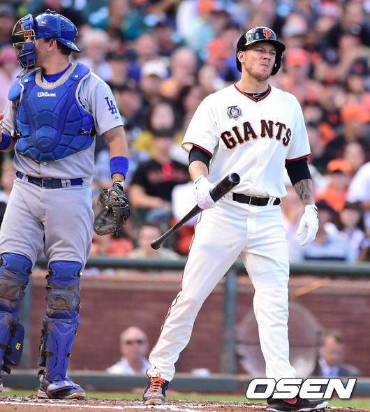 28일(이하 한국시간) 미국 캘리포니아주 샌프란시스코 AT&T 파크에서 열린 '2014 메이저리그' 샌프란시스코 자이언츠와 LA 다저스의 경기, 3회말 1사 1루 피비가 스리번트로 아웃되고 있다.