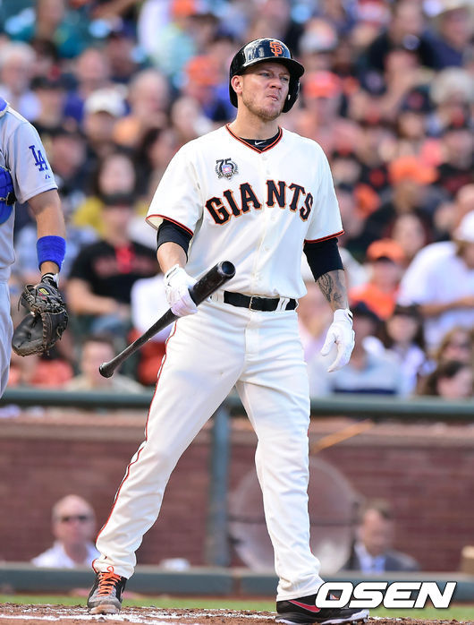 28일(이하 한국시간) 미국 캘리포니아주 샌프란시스코 AT&T 파크에서 열린 '2014 메이저리그' 샌프란시스코 자이언츠와 LA 다저스의 경기, 제이크 피비가 스리번트로 물러나며 인상을 찡그리고 있다.