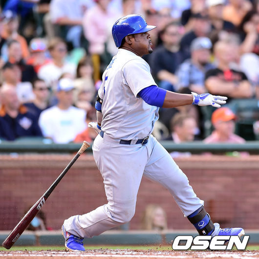 28일(이하 한국시간) 미국 캘리포니아주 샌프란시스코 AT&T 파크에서 열린 '2014 메이저리그' 샌프란시스코 자이언츠와 LA 다저스의 경기, 4회초 1사 1,2루 유리베가 동점 적시타를 치고 있다.