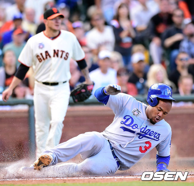 28일(이하 한국시간) 미국 캘리포니아주 샌프란시스코 AT&T 파크에서 열린 '2014 메이저리그' 샌프란시스코 자이언츠와 LA 다저스의 경기, 4회초 크로포드가 유리베의 적시타때 홈을 밟고 있다.