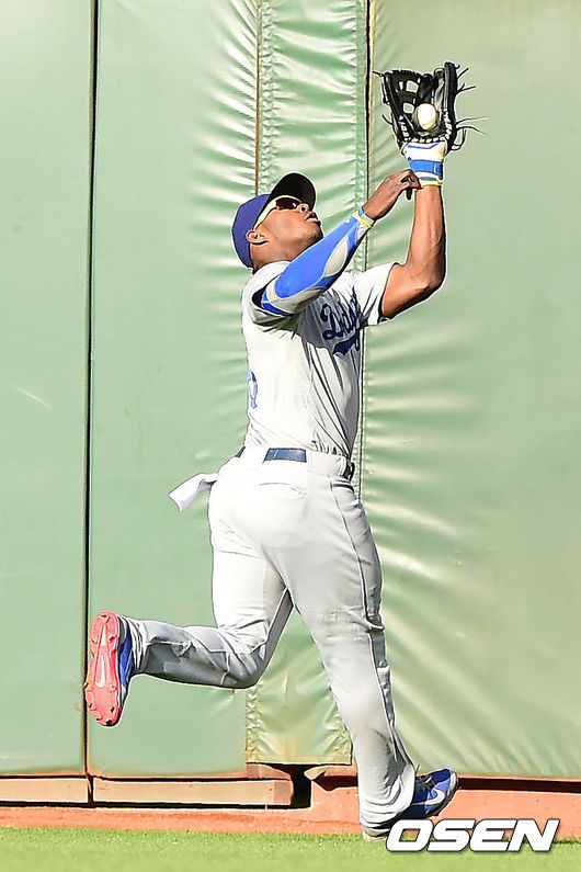 28일(이하 한국시간) 미국 캘리포니아주 샌프란시스코 AT&T 파크에서 열린 '2014 메이저리그' 샌프란시스코 자이언츠와 LA 다저스의 경기, 4회말 1사 1,2루 푸이그가 어글라의 타구를 잡고 있다.