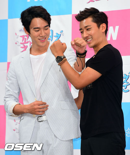 28일 오후 서울 강남구 임피리얼 팰리스 호텔에서 진행된 tvN '꽃보다 청춘' 제작발표회에서 유연석과 손호준이 우정 팔찌를 보이고 있다.