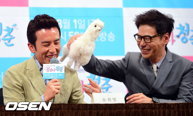 28일 오후 서울 강남구 임피리얼 팰리스 호텔에서 진행된 tvN '꽃보다 청춘' 제작발표회에서 윤상이 유희열에게 라마인형을 올려주고 있다.