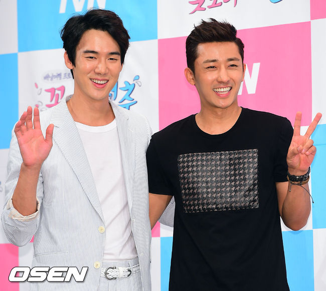 28일 오후 서울 강남구 임피리얼 팰리스 호텔에서 진행된 tvN '꽃보다 청춘' 제작발표회에서 유연석과 손호준이 포즈를 취하고 있다