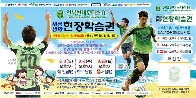 초등학생의 문화(스포츠부문) 체험 기회 확대와 현장학습 제고 일환으로 실시하고 있는 ‘여름방학 현장학습권’은 각 교육지청을 통해 여름방학전 각 초등학교로 배포(1인 1매)됐고, 8월 전북현대 홈 3경기(3일 전남전/ 6일 수원전/ 23일 서울전) 중 한 경기를 선택해서 무료관람이 가능하다.