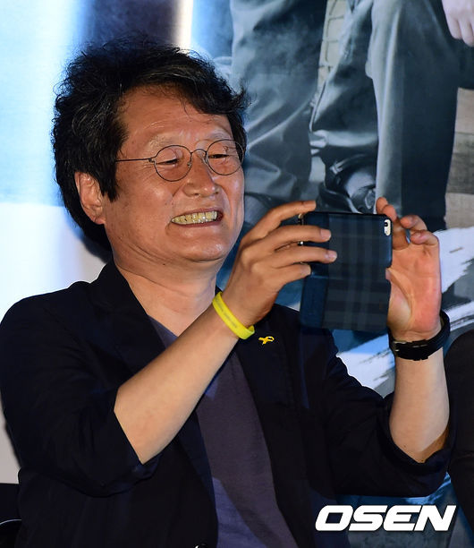 문성근이 간담회 도중 휴대폰으로 사진을 찍고 있다.