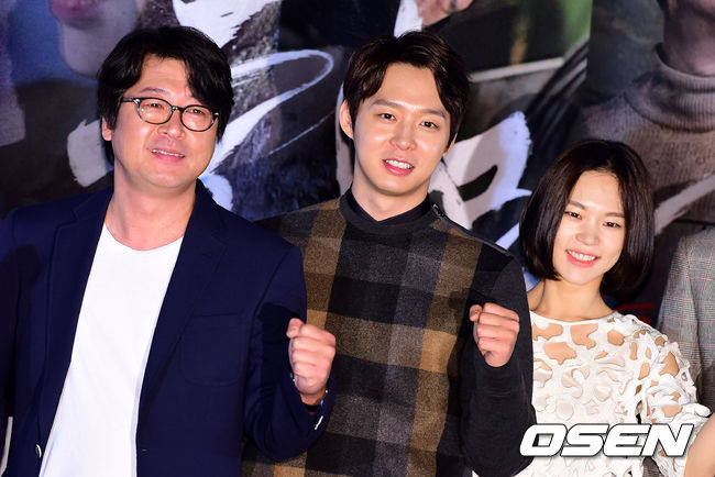 김윤석, 박유천, 한예리가 포토타임을 하고 있다.