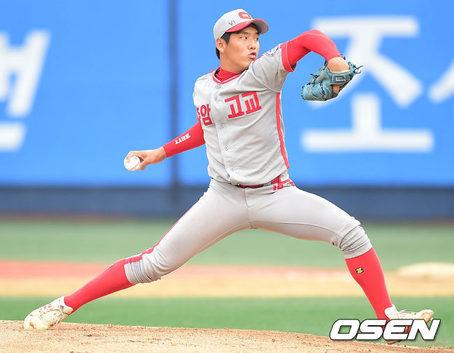 충암고 선발 홍정우가 힘차게 공을 뿌리고 있다.