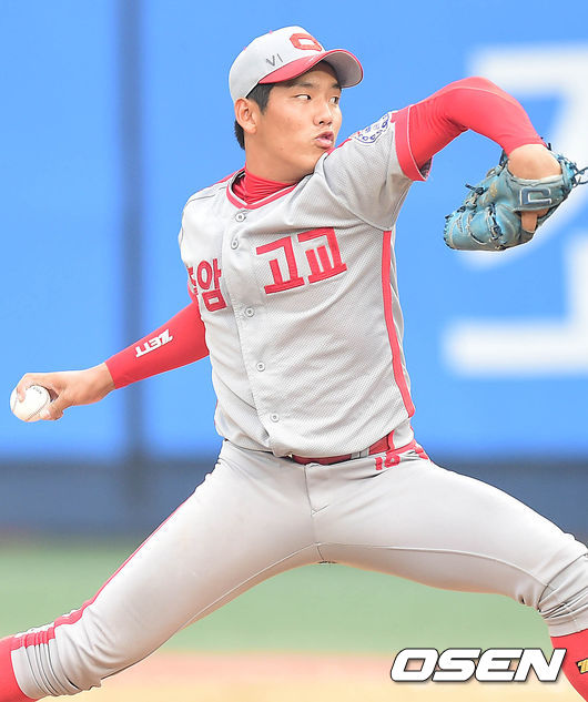 충암고 선발 홍정우가 힘차게 공을 뿌리고 있다.