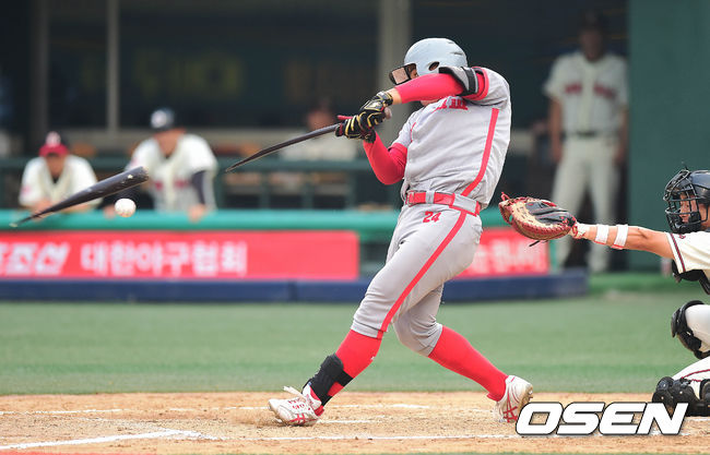 2회말 충암고 공격 무사 1루 상황 석호준이 내야 땅볼을 날릴 때 덕수고 투수 엄상백의 공에 배트가 부러지고 있다.