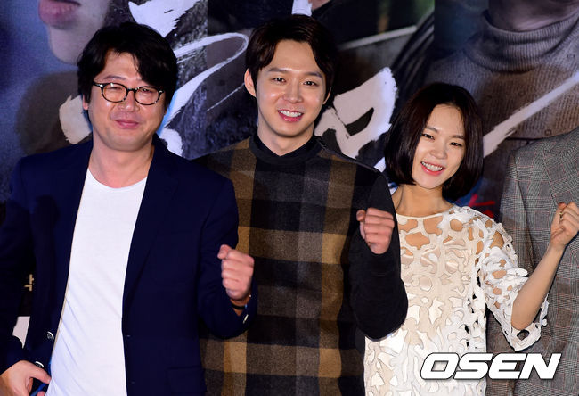 김윤석, 박유천, 한예리가 포토타임을 하고 있다.