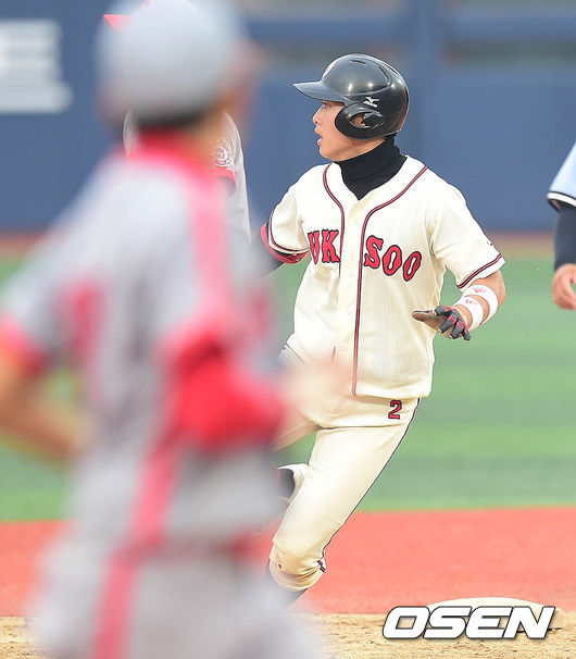 4회초 덕수고 공격 선두타자로 나선 김재성이 좌전안타를 날리고 상대 실책을 틈타 2루에 안착하고 있다.