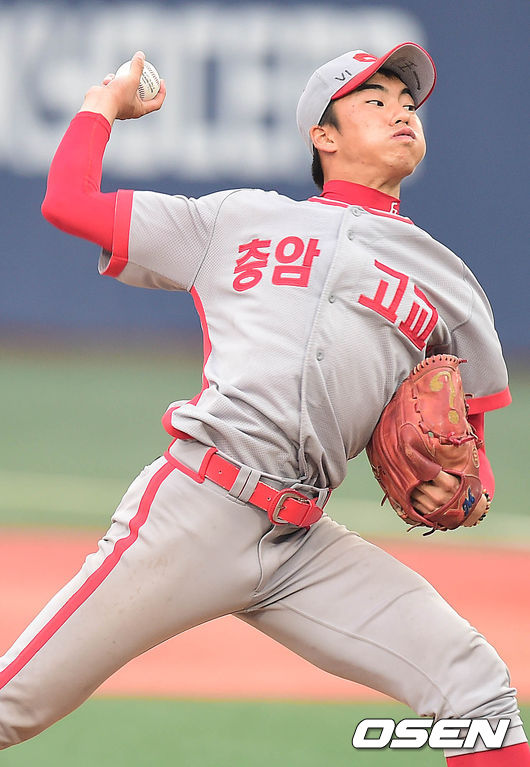 4회초 덕수고 공격 1사 3루 상황에서 마운드에 오른 충암고 투수 조한욱이 힘차게 공을 뿌리고 있다.