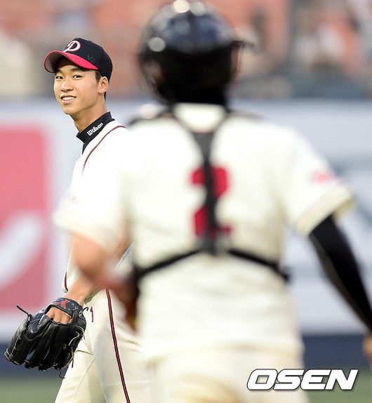 5회말 충암고 공격을 무실점으로 막아낸 덕수고 선발 엄상백과 포수 김재성이 인사를 나누고 있다.