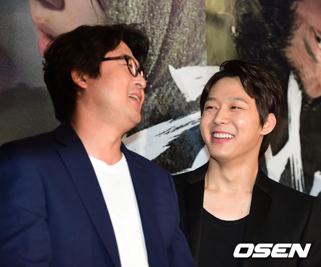 김윤석, 박유천이 레드카펫 행사에서 무대에 올라 즐거워하고 있다.