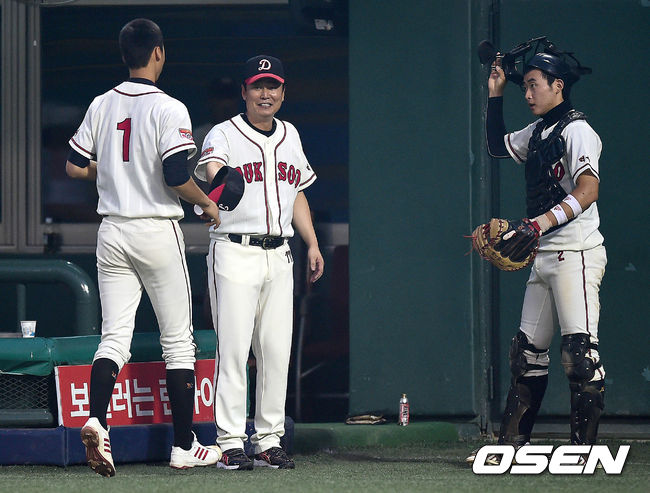 5회말 충암고 공격을 삼자범퇴로 막아낸 덕수고 선발 엄상백이 더그아웃으로 들어오며 정윤진 감독과 인사를 나누고 있다.
