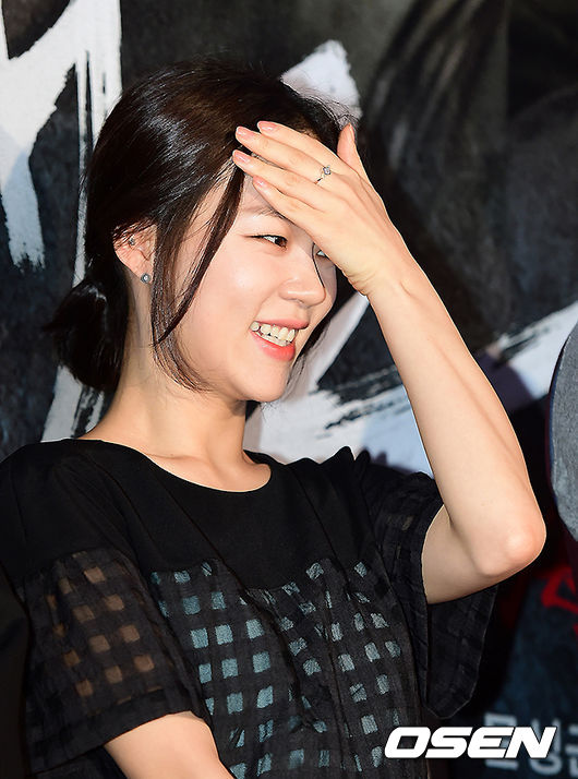 한예리가 레드카펫 행사에서 무대에 올라 수줍은 표정을 짓고 있다.