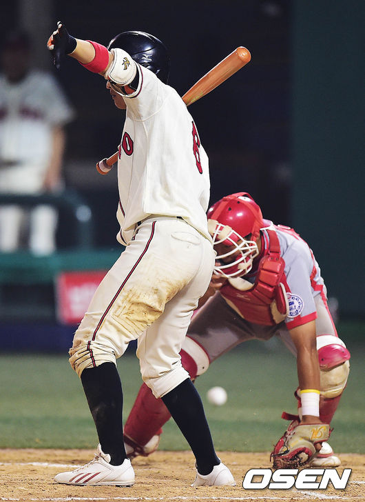 8회초 덕수고 공격 1사 1, 2루 상황 이지원 타석 때 충암고 투수 조한욱의 폭투로 공이 뒤로 빠지고 있다. 이 사이 2루 주자 김규동이 홈을 밟으며 1실점.