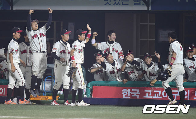 8회초 덕수고 공격 1사 1, 2루 상황 이지원 타석 때 충암고 투수 조한욱의 폭투로 2루 주자 김규동이 홈을 밟은 뒤 더그아웃 동료들과 인사를 나누고 있다.