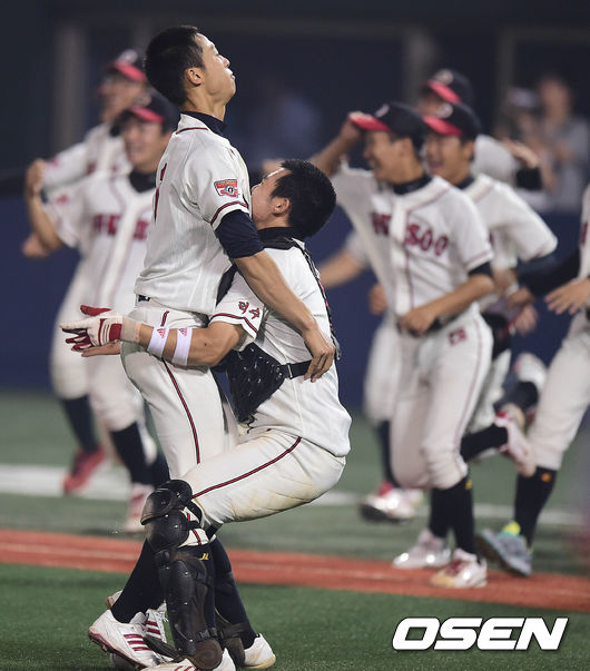완봉승으로 우승을 거머쥔 덕수고 선발 엄상백과 포수 김재성이 포옹을 하며 우승의 기쁨을 만끽하고 있다./dreamer@osen.co.kr