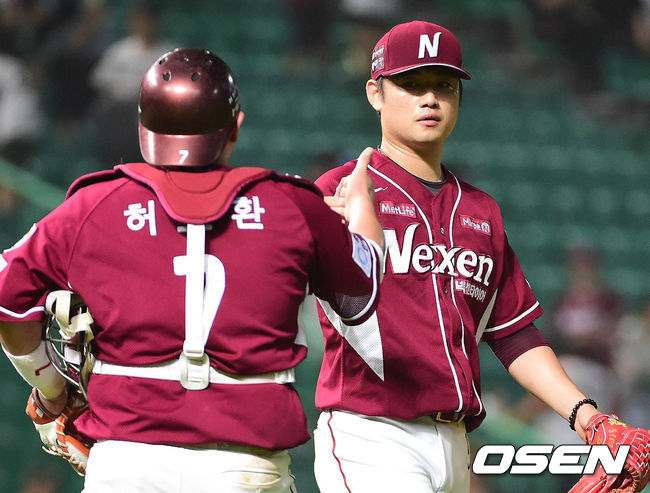 28일 오후 인천 문학구장에서 열린 '2014 한국야쿠르트 세븐 프로야구' SK 와이번스와 넥센 히어로즈의 경기 종료 후 손승락과 허도환이 하이파이브를 하고 있다.