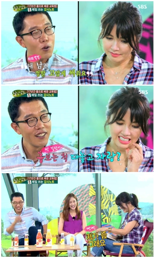 이날 신애라는 가족들이 공유하는 감사노트를 공개했다. 이어 "남편은 항상 고맙게 써준다. '신애라와 산책해서 감사', '신애라가 점점 예뻐져서 감사' 이런 식이다"라고 말했다. 이에 MC들은 "흉보는 척 하면서 대놓고 자랑한다"고 질투를 드러냈고 신애라는 "제가 좀 그렇다"고 웃었다.