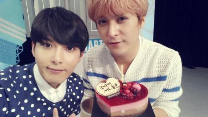 공개된 사진 속 려욱과 손동운은 ‘굿바이 MC동운’이 써진 케이크를 들고 나란히 앉아 카메라를 응시하고 있다. 특히 두 사람은 훈훈한 선후배 관계를 과시하면서 ‘남신’ 다운 외모를 자랑해 눈길을 끌었다.