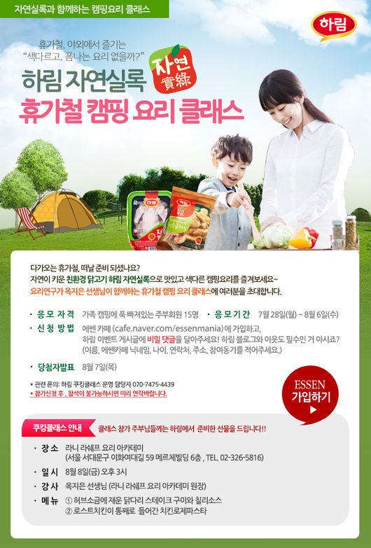 닭고기 전문기업 하림(대표 이문용)이 내달 8일 개최하는 ‘자연실록 캠핑요리 클래스’에 함께할 주부 참가자를 모집한다.