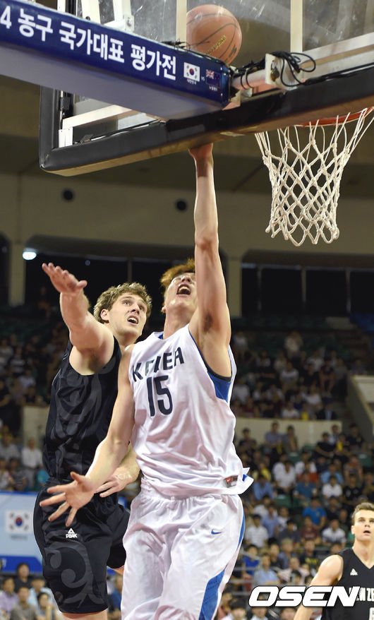 29일 오후 서울 잠실 학생체육관에서 열린 남자농구대표팀 평가전 한국과 뉴질랜드의 경기, 1쿼터 대한민국 김종규가 레이업슛을 시도하고 있다.