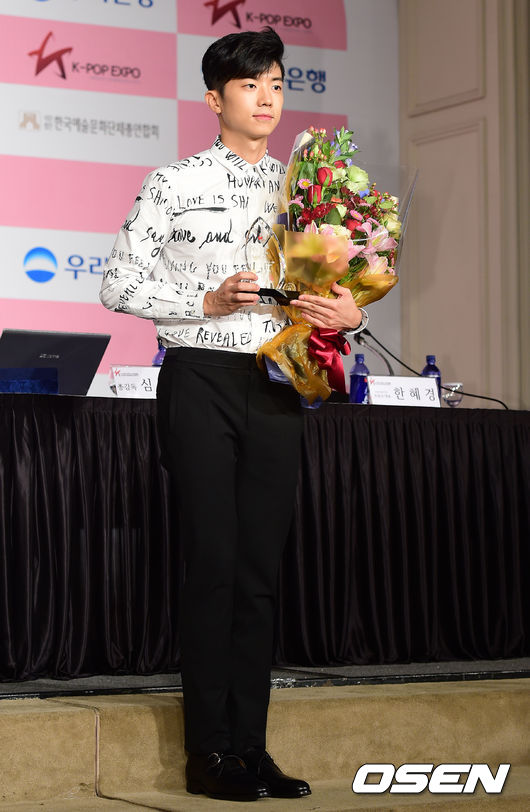 홍보대사로 위촉된 2PM 우영이 포토타임을 하고 있다. 이날 2PM은 우영만 참석했다.